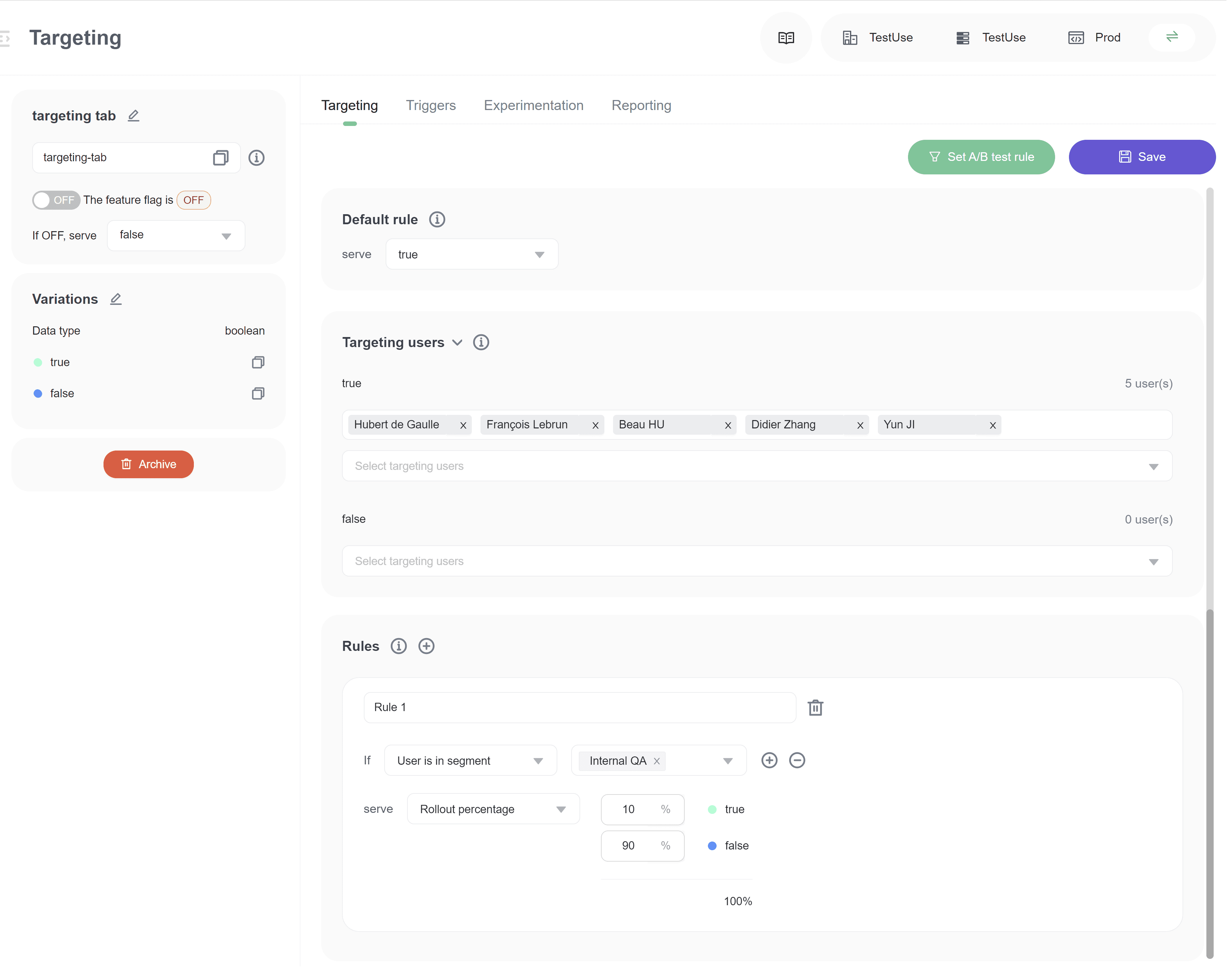 You can use the Targeting tab to roll features out for internal testing, private betas, or usability tests before performing a broader rollout. You can even set expiration dates for flag targeting if you know you only want users to receive a flag for a specific period of time (future feature).
